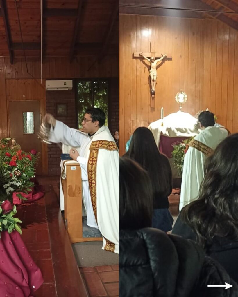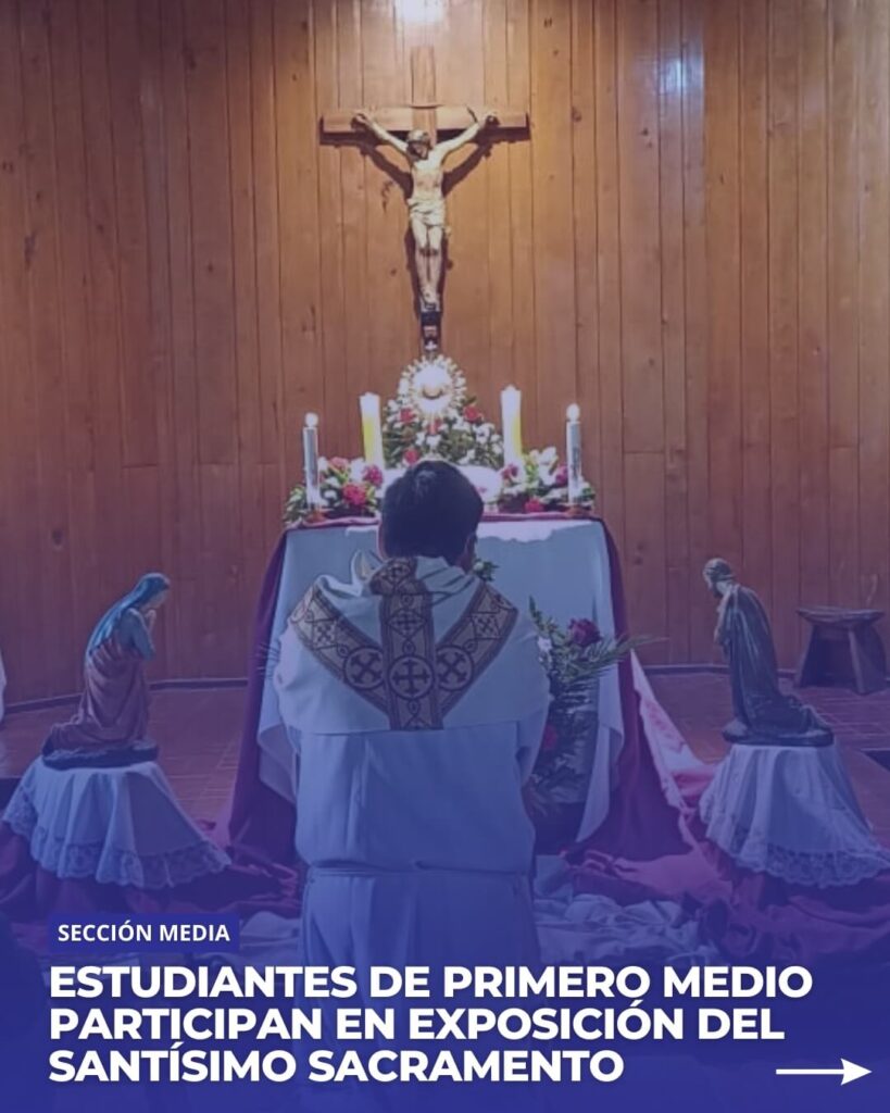 En Sección Media, al finalizar el primer semestre, se realizó la exposición y bendición del Santísimo Sacramento, a la que asistieron los estudiantes de Primero Medio. Esta actividad fue guiada por los Padres Juan Burgos y Fabián Calisto, en compañía de las Hermanas de la Congregación Mater Dei.