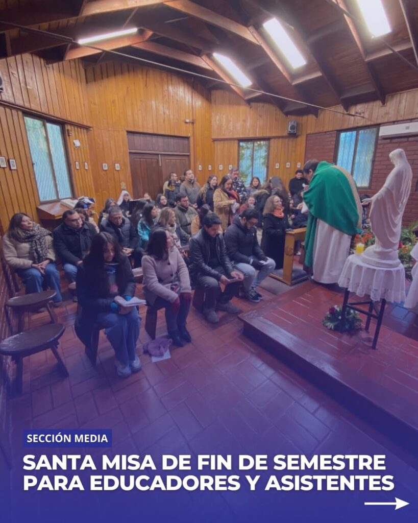 El miércoles 18 y jueves 19 de junio, al finalizar este primer semestre, el equipo de Pastoral de Sección Media organizará la celebración de la Santa Misa para profesores y asistentes de la educación, con el fin de agradecer a Dios y la Santísima Virgen María lo conseguido en este período y pedir por su ayuda e intercesión para el próximo.